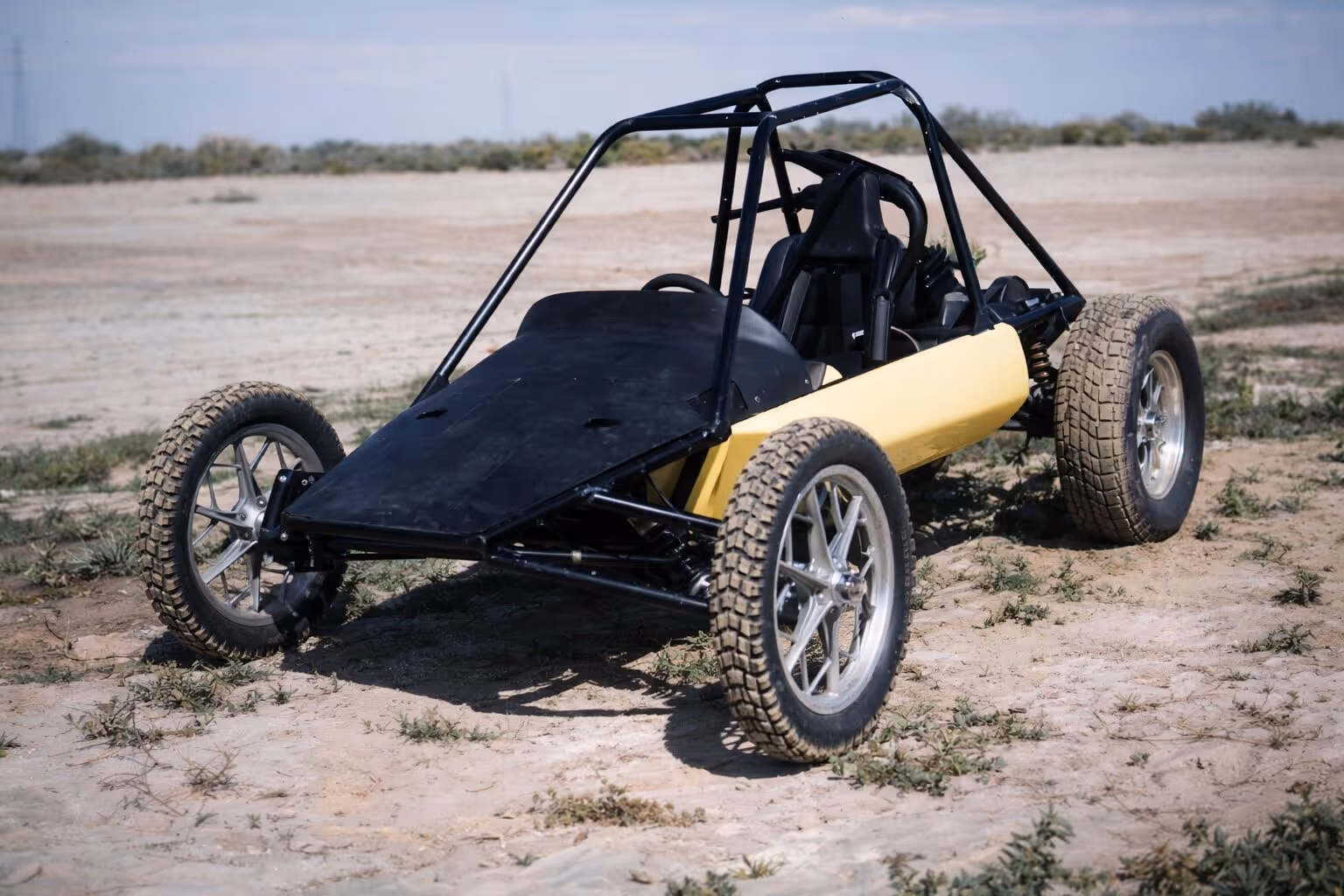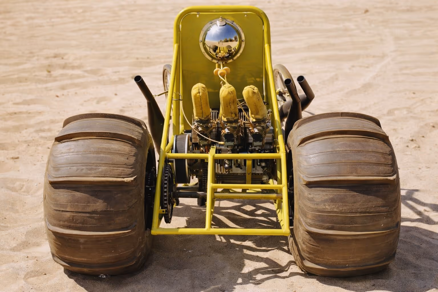 This vehicle was among the first to use paddle tires in competition. After demonstrating strong performance on heavy steel wheels, Carter developed lightweight composite alternatives. Using an aluminum wheel as a mold, he hand-laid inner and outer rims from fiberglass-reinforced polyester resin. The halves were bonded inside the tire, with the tire beads bonded directly to the wheel. One of the earliest known applications of structural composite wheel design.