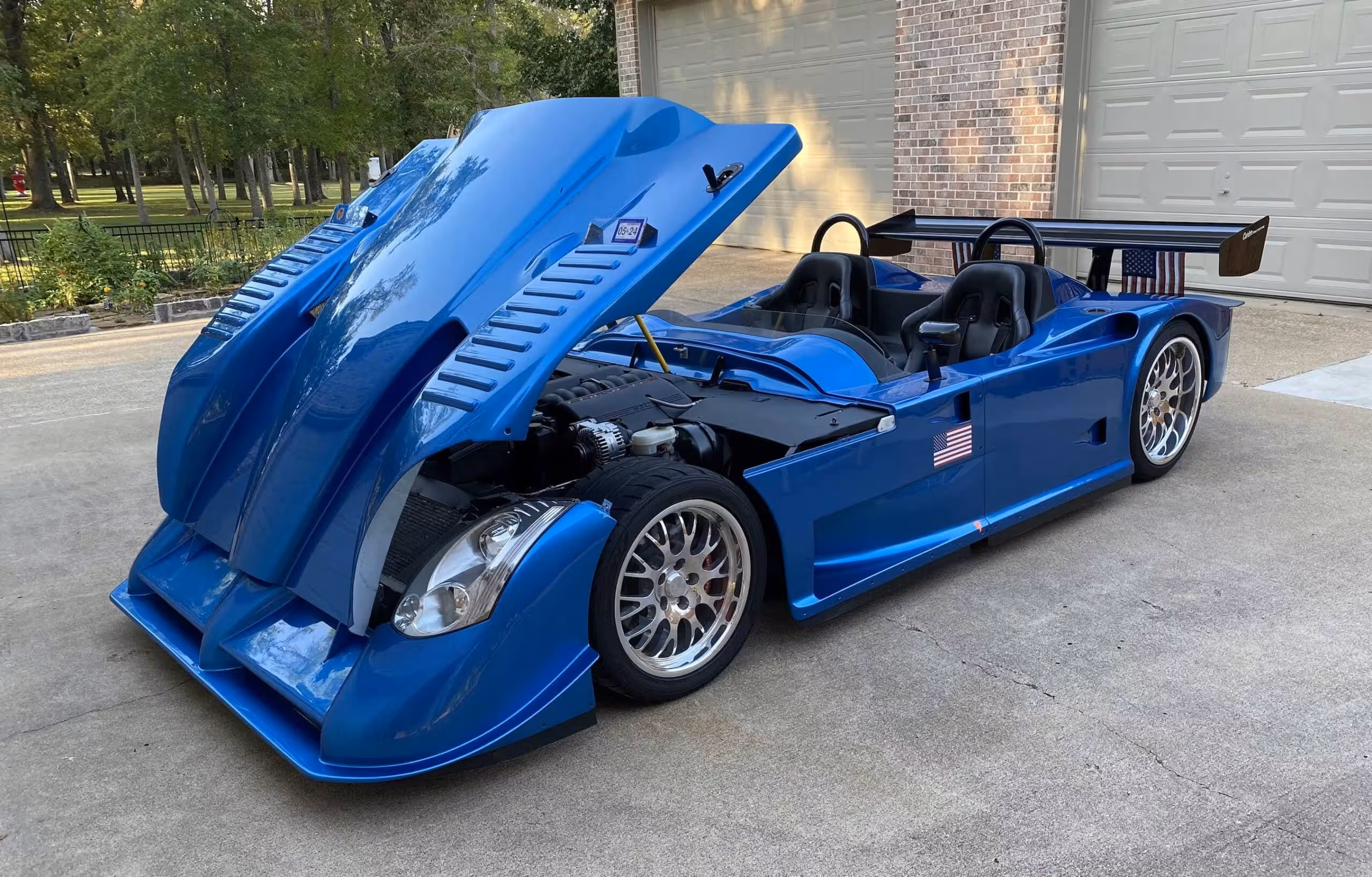 Hood raised with American flags mounted on wings, preparing for a Fourth of July car show.