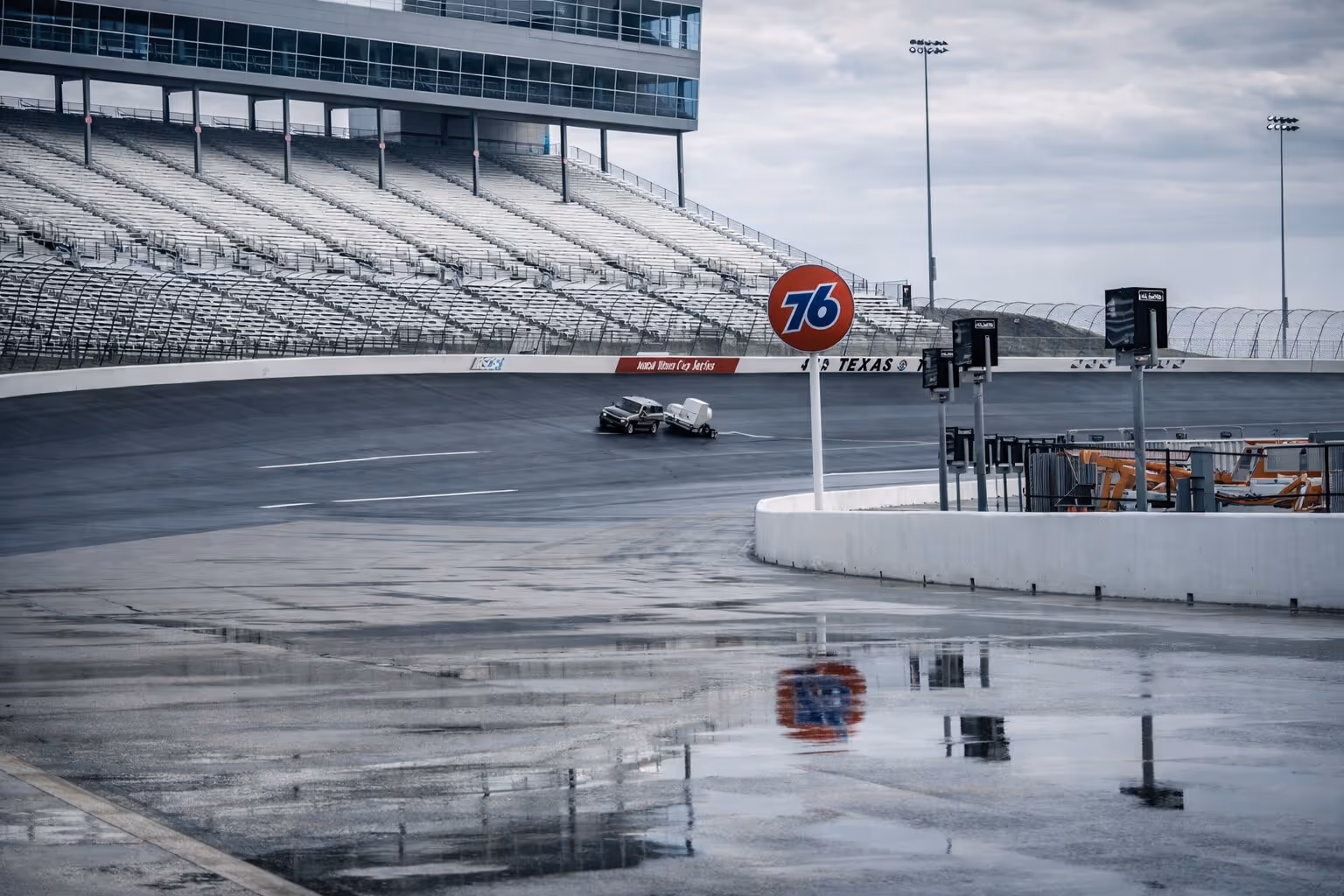 Shown here is a Trak Vak trailer on turn four at Texas Motor Speedway, where testing was permitted by TMS President and General Manager Eddie Gossage during non-operational, rainy conditions. This configuration operated on a different principle, using the same vacuum and tank while collecting water from tire spray at the backside of the tread.