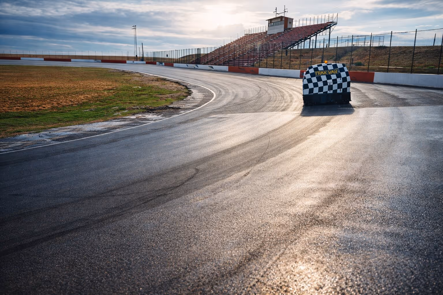 Foam rollers guide standing water into a 50 hp vacuum system, depositing it into a 500-gallon tank. Removal of standing water increases surface area exposure, leaving a damp asphalt surface that dries rapidly through natural evaporation. The system was deployed at the Indianapolis Motor Speedway in May 1999 and 2000 to dry the 5/8-mile pit road. During multiple rain events, Trak Vak removed standing water ahead of jet dryer operations, with remaining moisture dissipating without additional drying methods.