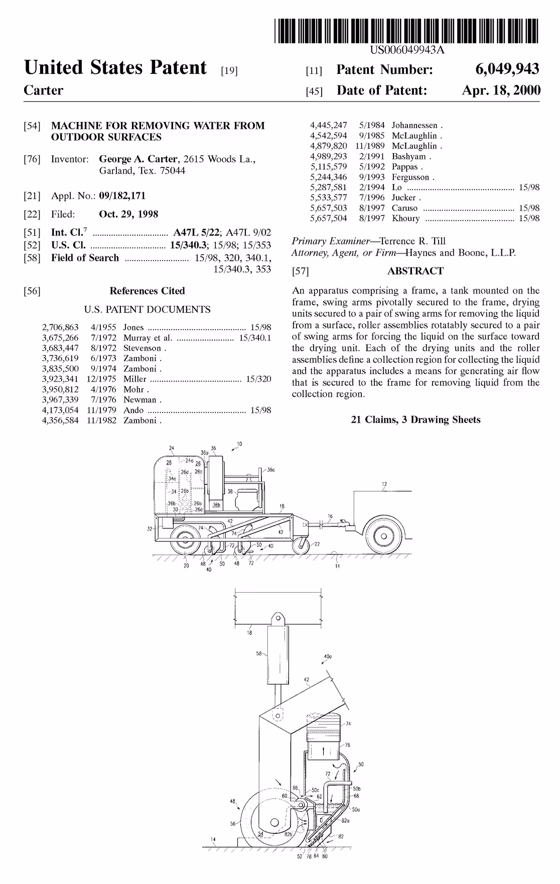 U.S. Patent 6,049,943 documents the Trak Vak system developed by George A. Carter III for efficient removal of water from outdoor surfaces.
